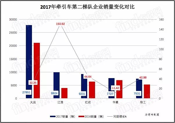 从第二阵营整体表现来看,2017年,大运、江淮、红岩、华菱、徐工这5家牵引车的合计销量仅6.2万辆,几乎只达到福田一家的销量,且不到解放一半的销量。