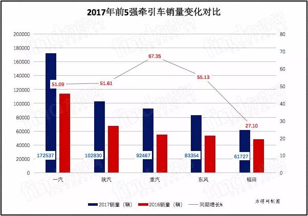看点三:行业有了更多新进入者,竞争更加激烈。2017年,庆铃、江铃等企业,开始进入重卡及牵引车市场,这类新进入者“有钱,更有理想”,都想在牵引车市场分到一块蛋糕,这也让销量常年不过万辆的老牌企业更有危机感。