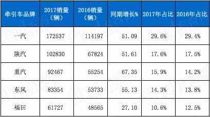 看点一:前5强企业市场集中度加强,抢到更大地盘。2017年,一汽、陕汽、重汽、东风、福田这前5强牵引车企业的市场份额增加,从2016年的87.5%上升至87.9%,份额增加0.4个百分点,行业集中度继续加强,强者更强。